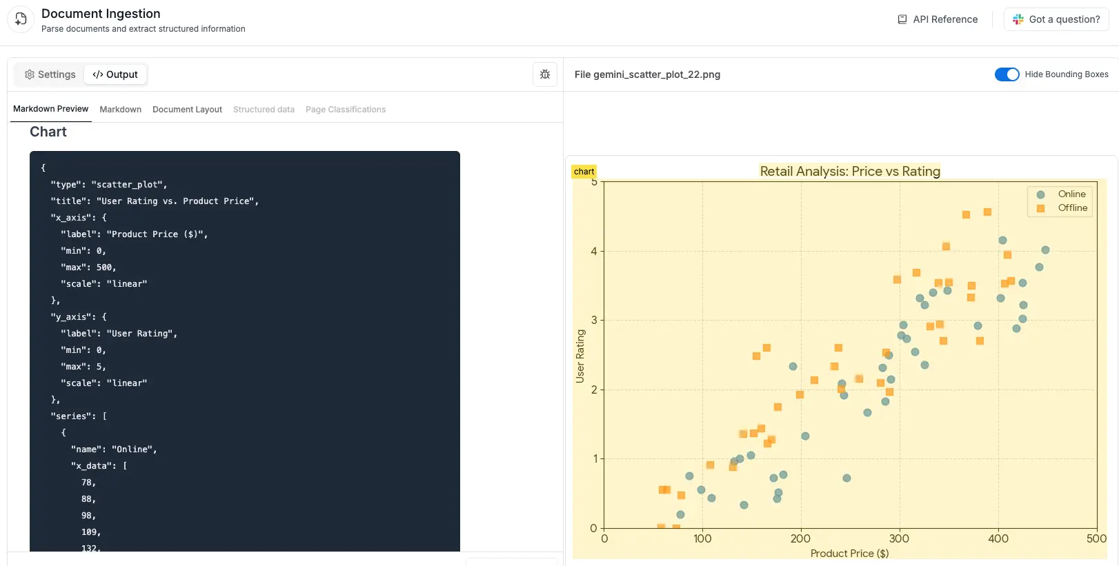 Chart extraction is currently available in all OCR models. As shown in the example below, charts are extracted and structured in a consistent JSON format.