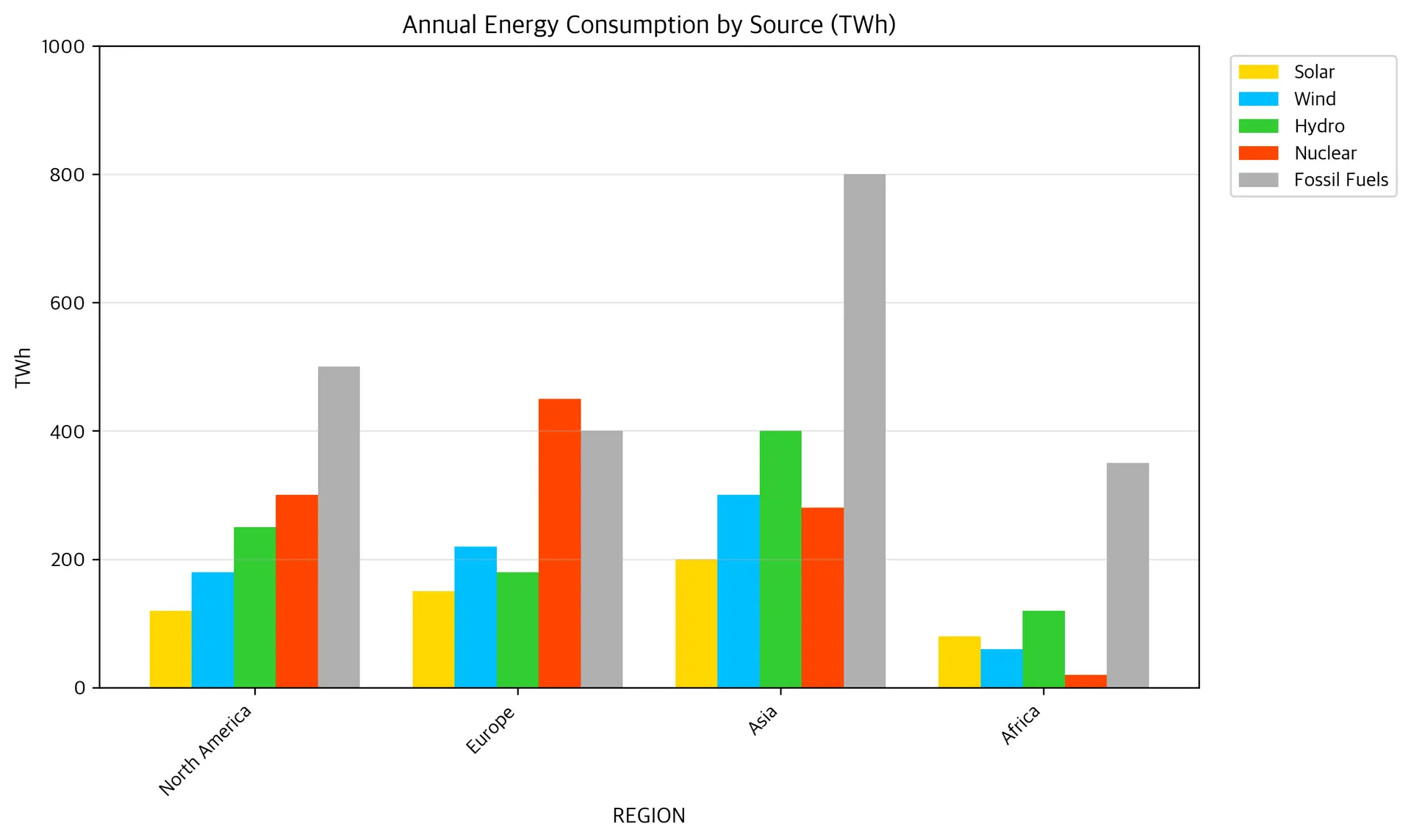 {"type": "bar_chart", "title": "Annual Energy Consumption by Source (TWh)", "orientation": "vertical", "x_axis": {"label": "REGION", "categories": ["North America", "Europe", "Asia", "Africa"]}, "y_axis": {"label": "TWh", "min": 0, "max": 1000, "format": "number"}, "series": [{"name": "Solar", "data": [120, 150, 200, 80], "color": "#FFD700", "show_values": false}, {"name": "Wind", "data": [180, 220, 300, 60], "color": "#00BFFF", "show_values": false}, {"name": "Hydro", "data": [250, 180, 400, 120], "color": "#32CD32", "show_values": false}, {"name": "Nuclear", "data": [300, 450, 280, 20], "color": "#FF4500", "show_values": false}, {"name": "Fossil Fuels", "data": [500, 400, 800, 350], "color": "#B0B0B0", "show_values": false}], "bar_style": "grouped", "grid": true}