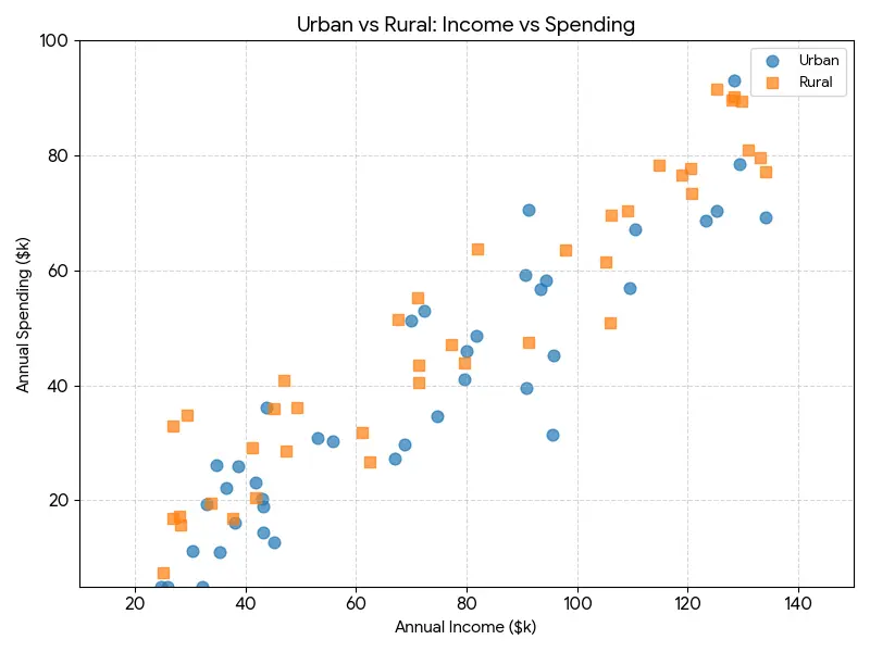 {"type": "scatter_plot", "title": "Urban vs Rural: Income vs Spending", "x_axis": {"label": "Annual Income ($k)", "min": 10, "max": 150, "scale": "linear"}, "y_axis": {"label": "Annual Spending ($k)", "min": 0, "max": 100, "scale": "linear"}, "series": [{"name": "Urban", "x_data": [24, 32, 30, 35, 33, 36, 35, 39, 42, 43, 43, 45, 44, 53, 56, 67, 69, 70, 72, 75, 80, 80, 82, 91, 91, 91, 93, 94, 96, 96, 110, 111, 123, 125, 128, 130, 134], "y_data": [4, 4, 11, 11, 19, 22, 26, 26, 23, 19, 14, 13, 36, 31, 30, 27, 30, 52, 53, 35, 41, 46, 49, 40, 59, 71, 57, 58, 45, 32, 57, 67, 69, 71, 93, 79, 70], "color": "#5da5da", "marker": "o", "alpha": 0.75}, {"name": "Rural", "x_data": [25, 27, 28, 27, 29, 34, 38, 41, 42, 45, 47, 47, 49, 61, 63, 68, 71, 71, 71, 77, 80, 82, 91, 98, 105, 106, 106, 109, 115, 119, 121, 121, 125, 128, 129, 131, 133, 134], "y_data": [7, 17, 16, 33, 35, 19, 17, 29, 20, 36, 41, 29, 36, 32, 27, 51, 55, 41, 44, 47, 44, 63, 48, 63, 62, 51, 70, 71, 78, 77, 78, 73, 91, 90, 89, 81, 80, 78], "color": "#faa43a", "marker": "s", "alpha": 0.75}], "legend_position": "upper right", "grid": true}