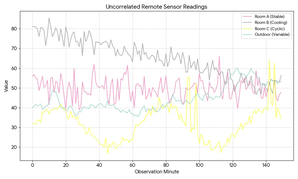 {"type": "line_chart", "title": "Uncorrelated Remote Sensor Readings", "x_axis": {"label": "Observation Minute", "values": [0, 2, 4, 6, 8, 10, 12, 14, 16, 18, 20, 22, 24, 26, 28, 30, 32, 34, 36, 38, 40, 42, 44, 46, 48, 50, 52, 54, 56, 58, 60, 62, 64, 66, 68, 70, 72, 74, 76, 78, 80, 82, 84, 86, 88, 90, 92, 94, 96, 98, 100, 102, 104, 106, 108, 110, 112, 114, 116, 118, 120, 122, 124, 126, 128, 130, 132, 134, 136, 138, 140, 142, 144, 146, 148, 150], "scale": "linear"}, "y_axis": {"label": "Value", "min": 15, "max": 90, "scale": "linear"}, "series": [{"name": "Room A (Stable)", "data": [56, 54, 48, 55, 50, 54, 41, 55, 52, 49, 40, 44, 53, 40, 60, 42, 50, 39, 41, 53, 48, 46, 55, 62, 51, 50, 51, 49, 56, 45, 42, 55, 44, 58, 57, 61, 43, 48, 40, 51, 52, 51, 46, 55, 44, 46, 50, 48, 45, 50, 55, 45, 48, 54, 55, 43, 41, 50, 49, 50, 52, 58, 50, 47, 43, 53, 48, 48, 51, 56, 44, 66, 45, 44, 55, 48], "color": "#F472B6", "line_style": "-"}, {"name": "Room B (Cooling)", "data": [81, 80, 76, 80, 79, 71, 85, 76, 80, 73, 66, 79, 75, 66, 73, 73, 71, 73, 79, 71, 66, 70, 67, 66, 71, 68, 66, 63, 73, 69, 66, 72, 65, 64, 66, 63, 69, 64, 64, 61, 67, 60, 70, 65, 64, 63, 69, 64, 64, 61, 67, 60, 70, 65, 64, 68, 65, 60, 68, 62, 58, 58, 64, 57, 57, 58, 59, 64, 55, 60, 56, 58, 52, 59, 60, 57], "color": "#9CA3AF", "line_style": "-"}, {"name": "Room C (Cyclic)", "data": [31, 32, 34, 33, 38, 39, 37, 39, 40, 38, 38, 35, 36, 31, 31, 31, 27, 27, 30, 26, 26, 24, 21, 21, 25, 20, 20, 22, 19, 21, 22, 25, 24, 24, 22, 25, 24, 31, 31, 32, 34, 36, 36, 39, 38, 38, 32, 55, 49, 52, 22, 26, 21, 21, 19, 19, 24, 19, 21, 22, 20, 25, 27, 25, 29, 32, 32, 36, 32, 39, 39, 64, 42, 62, 40, 34], "color": "#FDE047", "line_style": "-"}, {"name": "Outdoor (Variable)", "data": [40, 41, 41, 39, 41, 40, 42, 48, 47, 45, 41, 39, 40, 41, 36, 38, 40, 39, 41, 41, 40, 41, 42, 40, 40, 44, 41, 41, 39, 38, 39, 37, 39, 36, 36, 38, 40, 38, 39, 39, 39, 38, 39, 40, 41, 42, 44, 43, 46, 42, 42, 43, 47, 45, 46, 47, 45, 45, 45, 46, 52, 53, 57, 57, 60, 57, 55, 57, 60, 58, 55, 51, 53, 52, 53, 53], "color": "#9CD9D3", "line_style": "-"}], "legend_position": "upper right", "grid": true}