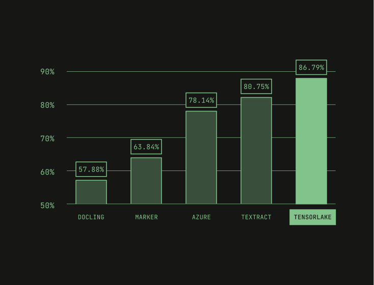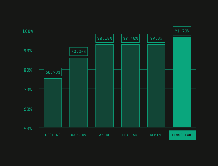 Tensorlake scores 92% in structured output accuracy, scoring above Gemini Flash 2.5 and other leading VLMs